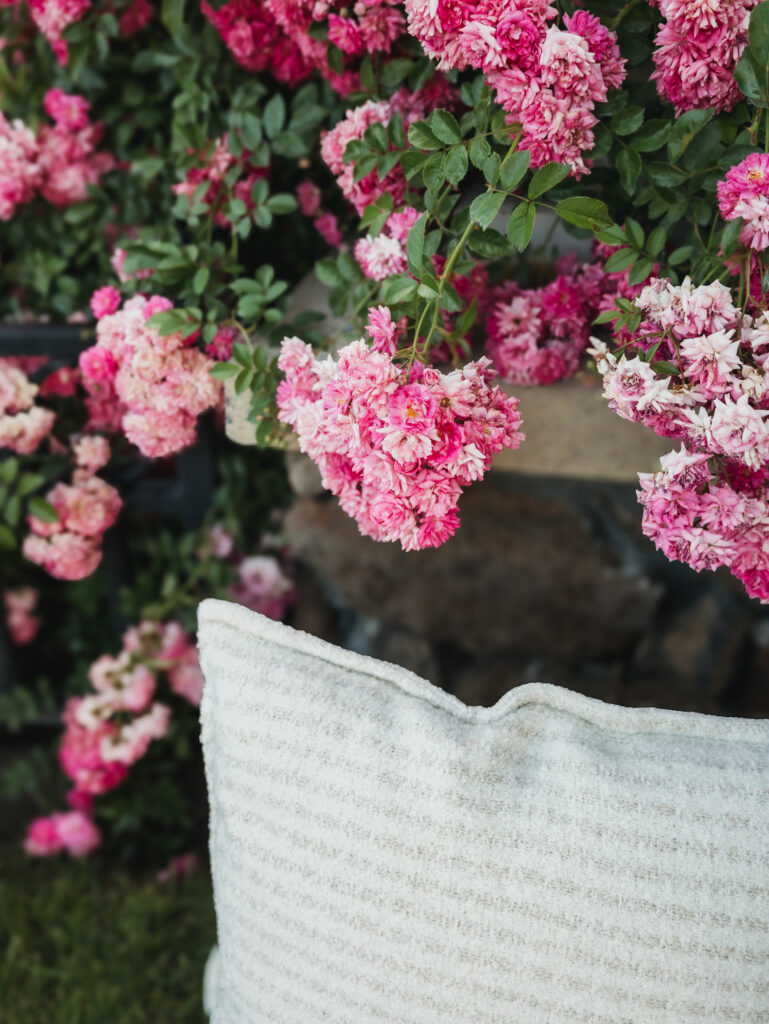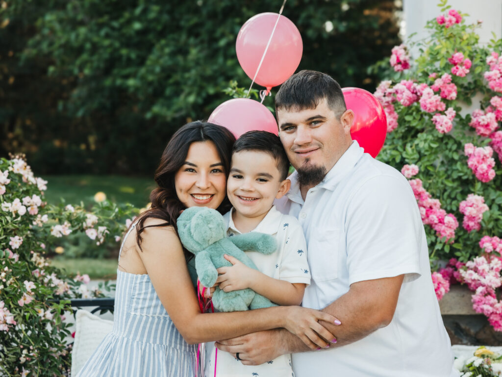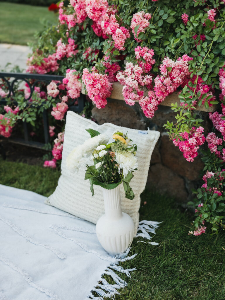 We set up a small picnic-inspired space with cozy textures and simple details, allowing the roses to naturally frame the moment. The pillows, vase, picnic basket, and blanket all came from my client closet, which has more than clothes! The food helped create a fun photoshoot, and helped get their son excited too!